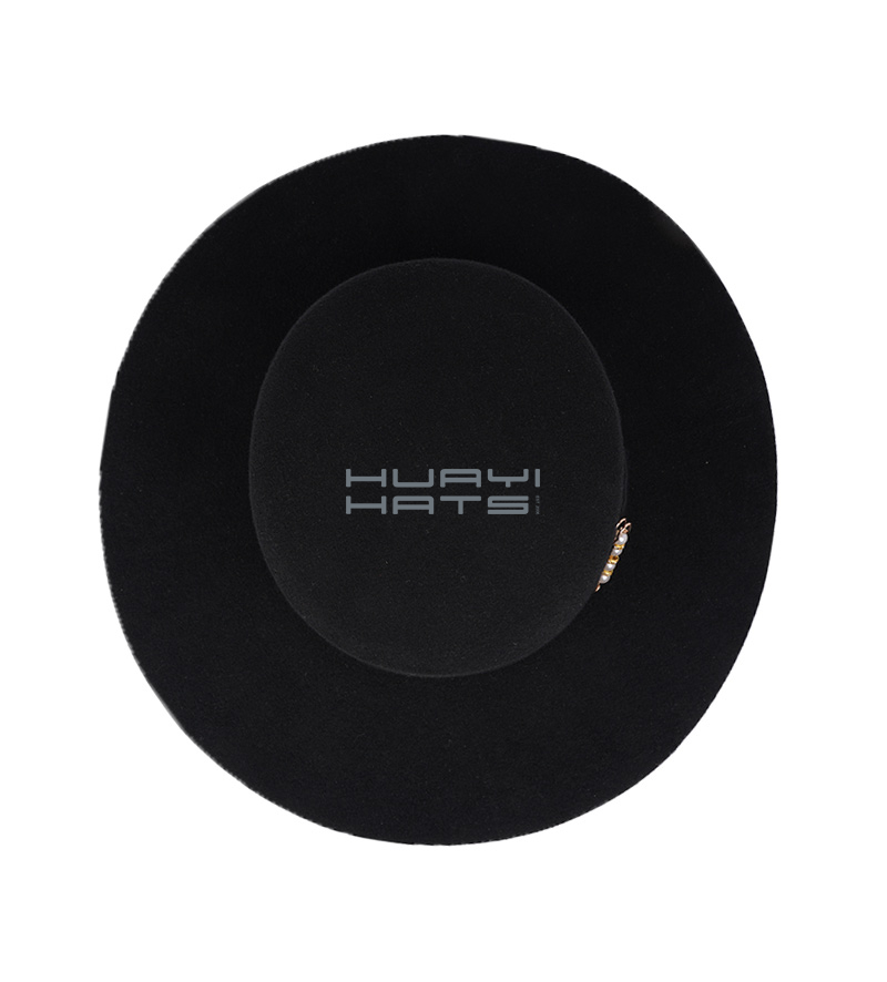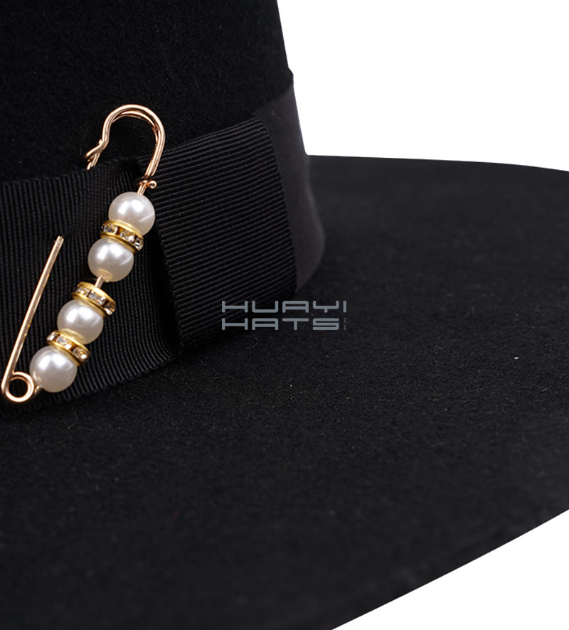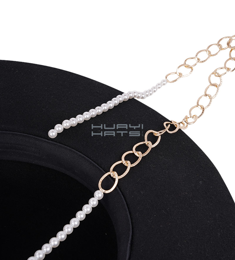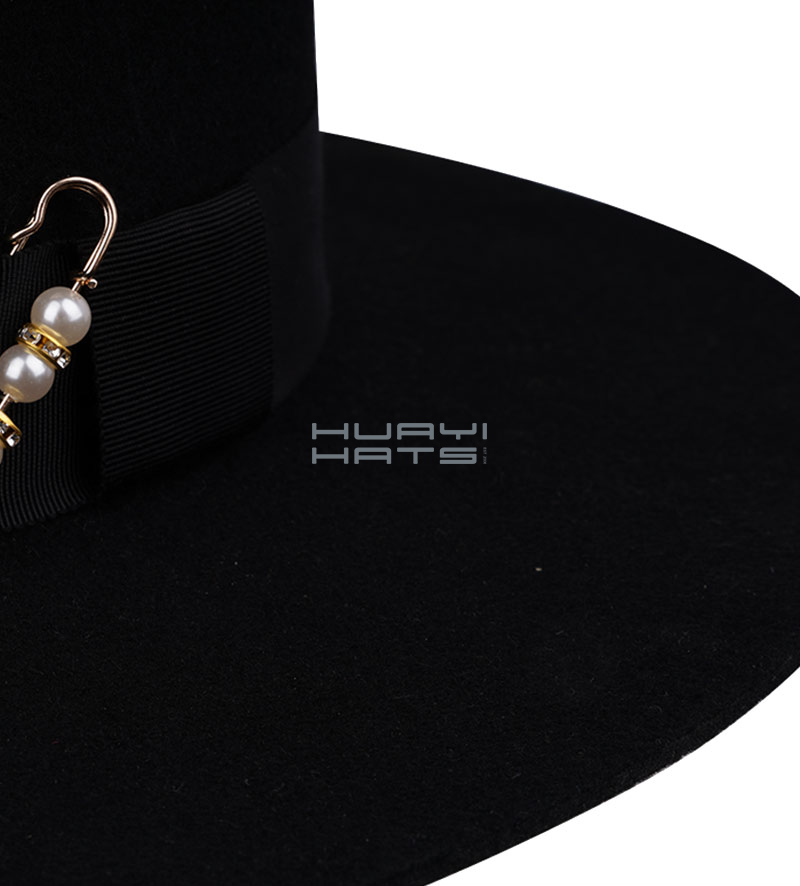 Womens Wool Felt Boater Hat Wide Brim Black Equipped Fashion Chin Cord