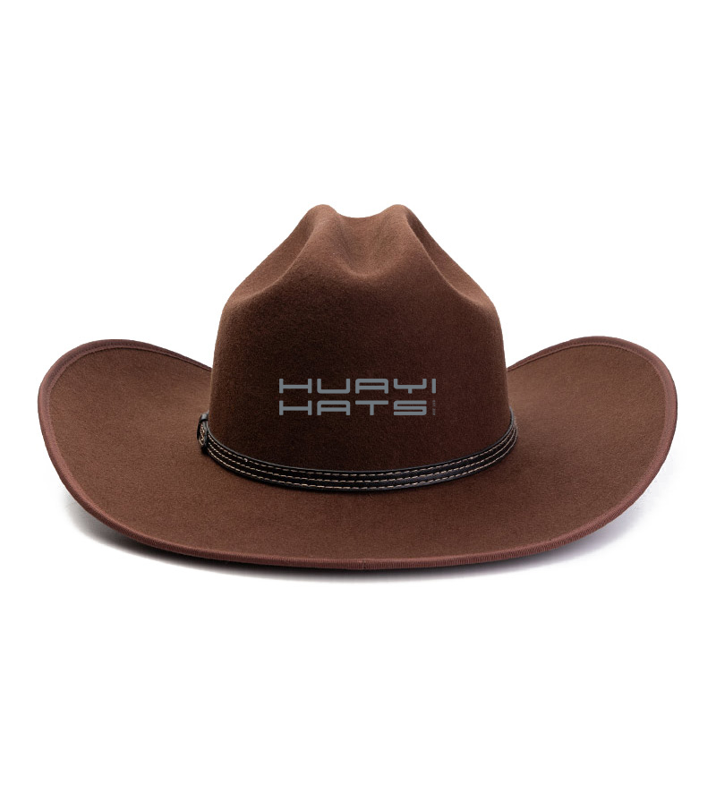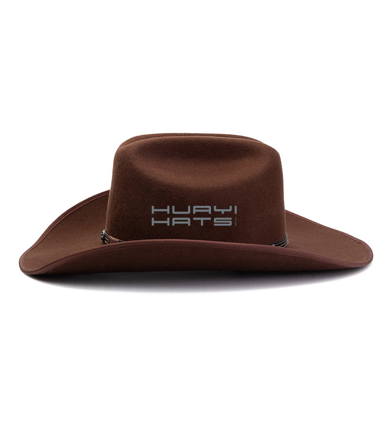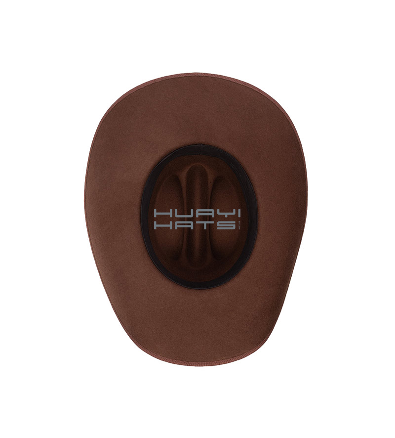 This fashion wool cowboy hat is a made of 100% Australian wool felt. It has a 4 1/4" brim that rolls-up at the sides and shapes flat in the front and back. The crown is open crown style and measures 4.7 " high in front. There is a comfortable, wickable interior sweatband. It features a stiff wide brim and a thin leather hatband. Wear it without worry on a light rainy or snowy weather. Brown color. Felt makes a superior fabric for a cowboy hat because it is light, smooth, much harder to tear than other fabrics, and is naturally water resistant.
