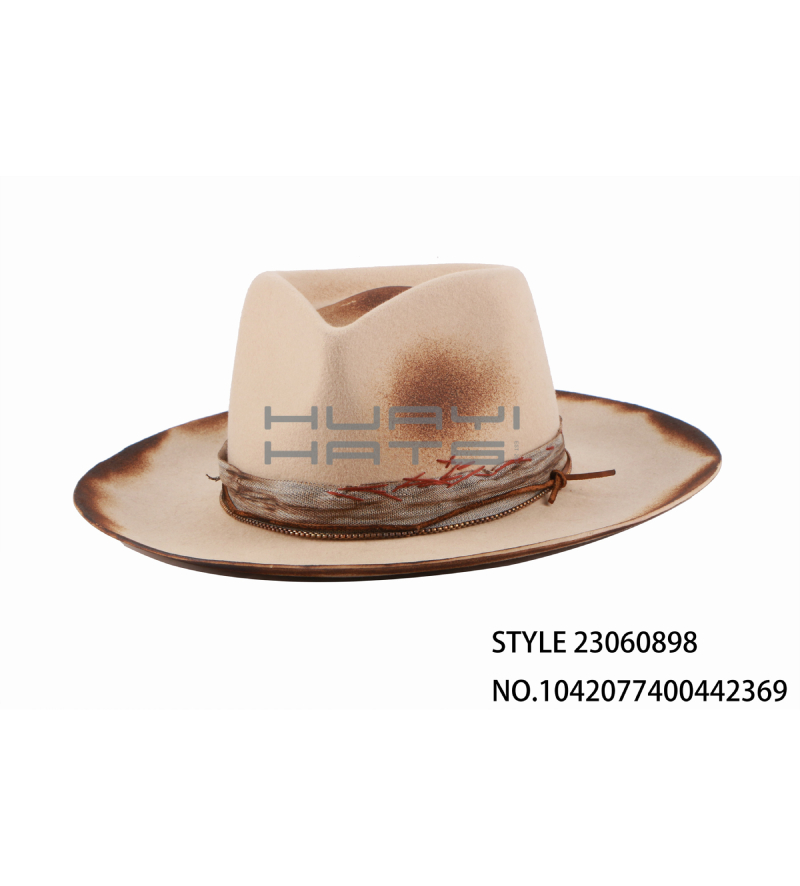 Distressed Beige Mens Raised Brim Wool Felt Fedora Hat Customizable Size And Color