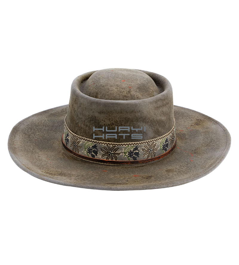 Mens Wide Brim Wool Felt Distressed Pork pie Fedora Hats With high-quality Grosgrain Ribbon