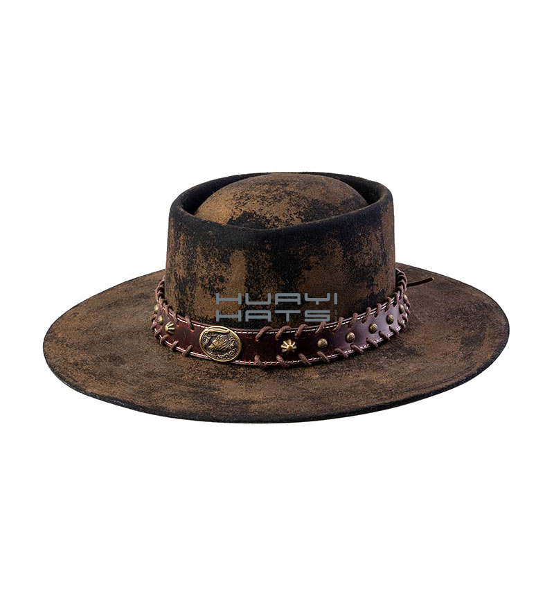 This wide leather cowboy hat band is made of premium genuine leather, which will be durable enough to last you for a very long time. Hand tooled and presented in a luxurious cord style finished with an ornate metal buckle set. Proudly supplied in Huayi Hats Factory, we assure you top quality merchandise. Finish off your Wasteland Weekend Hat or Cosplay Top Hat or any ol' hat with a cowboy hatband! Or we can custom make you a cowboy hat band without any decorations and just leather.