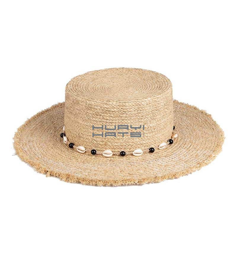 Wide Brim Womens Boater Straw Hat With Natural Raffia Handwoven Braid Straw Flat Top Hat